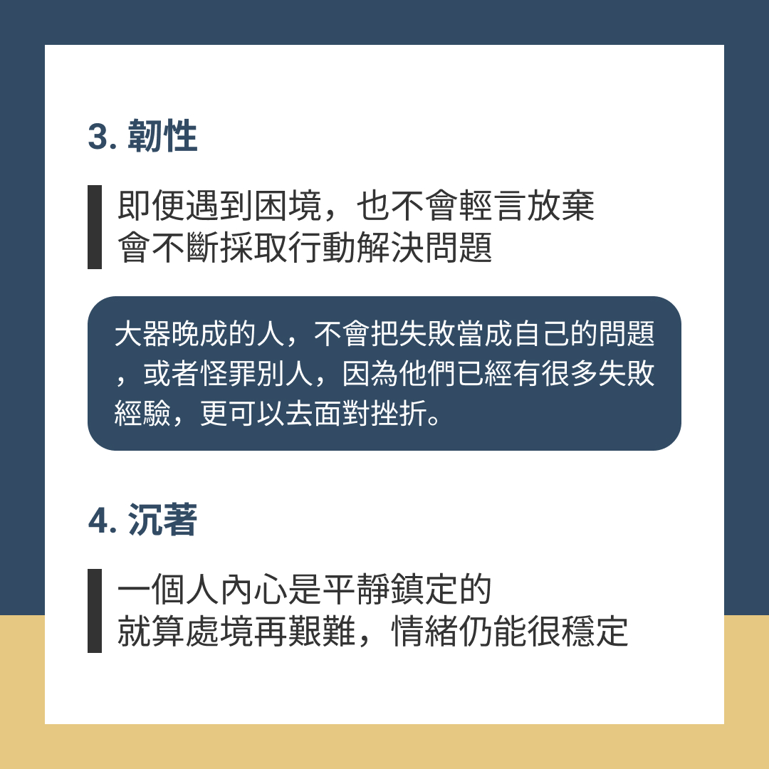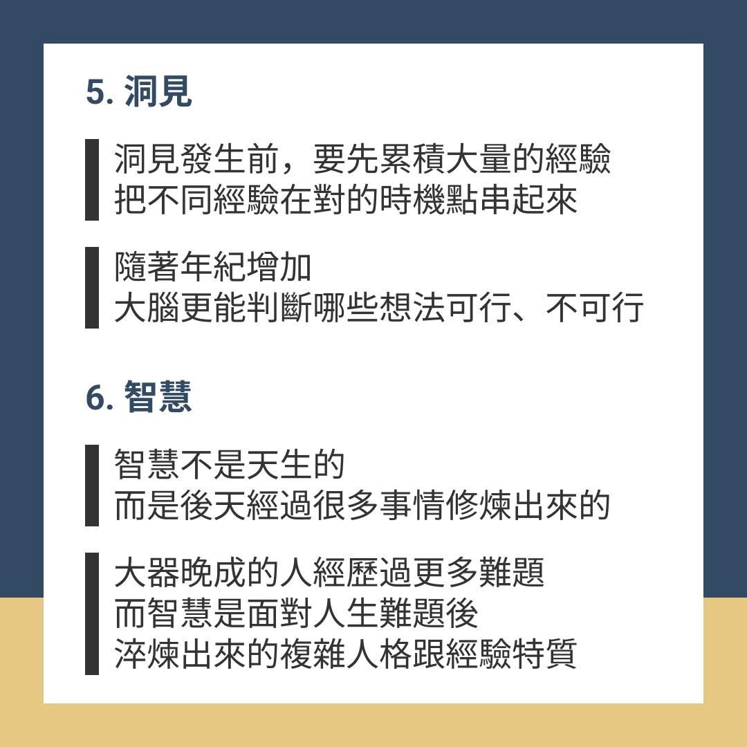 大器晚成的人經歷過更多難題,而智慧是面對人生難題後,淬煉出來的複雜人格跟經驗特質