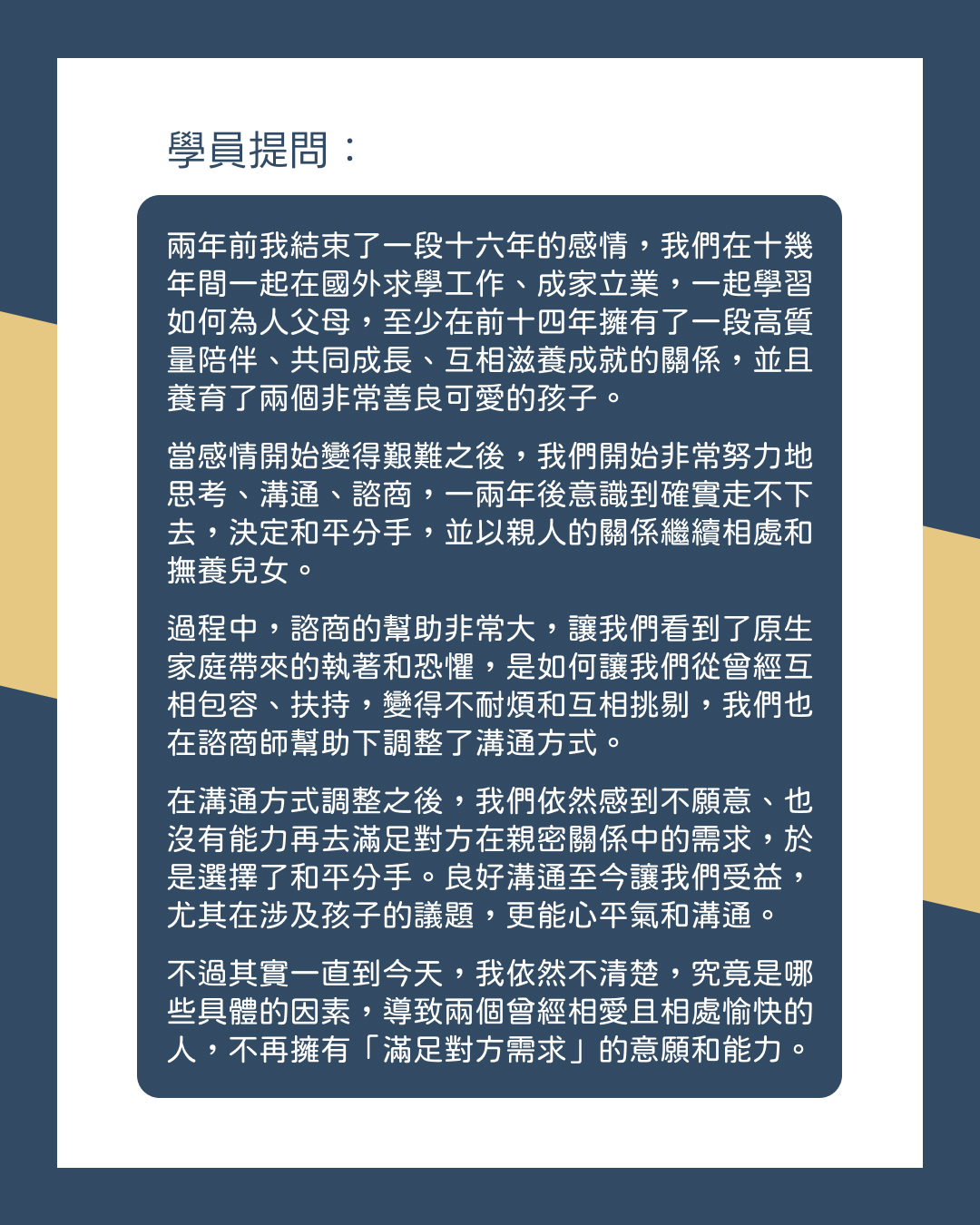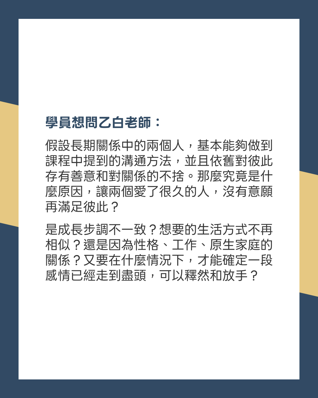 假設長期關係中的兩個人,基本能夠做到課程中提到的溝通方法,並且依舊對彼此存有善意和對關係的不捨。那麼究竟是什麼原因,讓兩個愛了很久的人,沒有意願再滿足彼此?