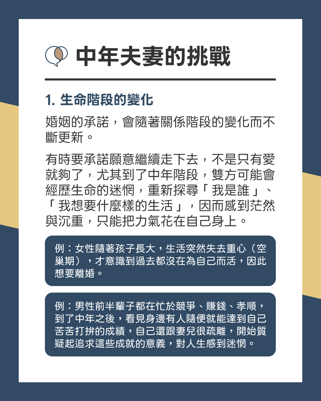 例:女性隨著孩子長大,生活突然失去重心(空巢期),才意識到過去都沒在為自己而活,因此想要離婚。
