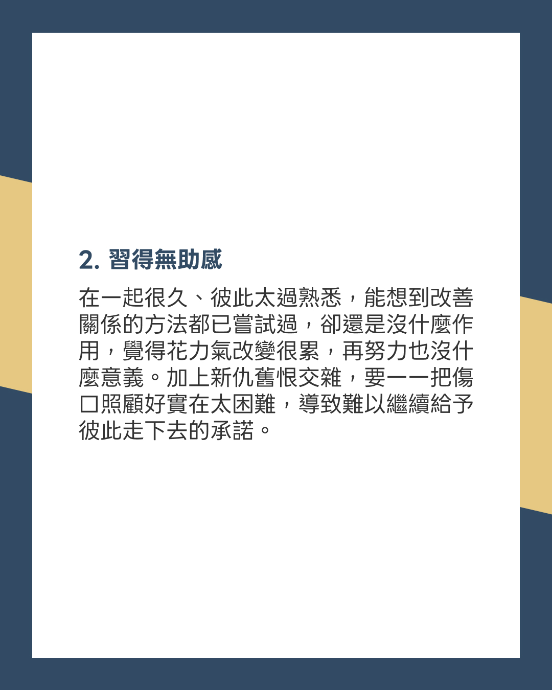 在一起很久、彼此太過熟悉,能想到改善關係的方法都已嘗試過,卻還是沒什麼作用,覺得花力氣改變很累,再努力也沒什麼意義。加上新仇舊恨交雜,要一一把傷口照顧好實在太困難,導致難以繼續給予彼此走下去的承諾。
