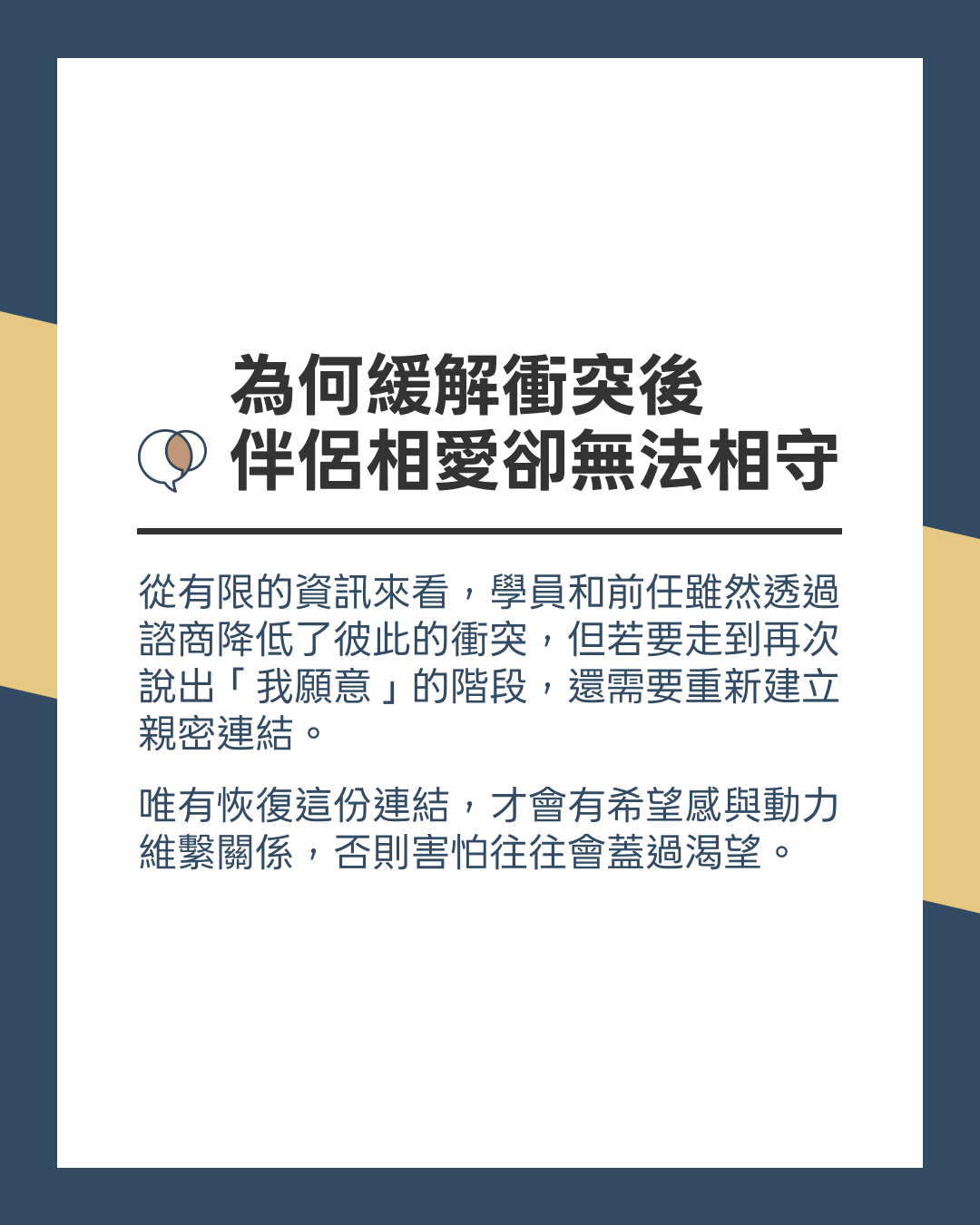 從有限的資訊來看,學員A和前任雖然透過諮商降低了彼此的衝突,但若要走到再次說出「我願意」的階段,還需要重新建立親密連結。因為唯有恢復這份連結,才會有希望感與動力維繫關係,否則害怕往往會蓋過渴望。