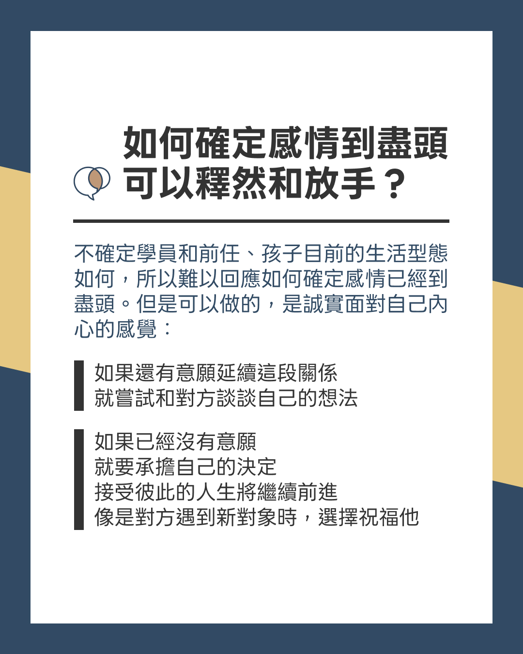 不確定學員A和前任、孩子目前的生活型態如何:離婚後仍否住在一起?還是住得很近,假日仍會一起進行親子活動?或僅在孩子的事情上有交集?所以難以回應如何確定感情已經到盡頭。但是可以做的,是誠實面對自己內心的感覺: