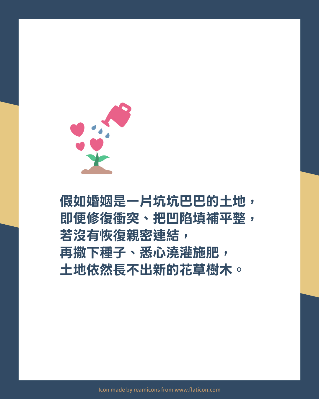 假如婚姻是一片坑坑巴巴的土地,即便把凹陷填補平整(修復衝突),若沒有再撒下種子、悉心澆灌施肥(恢復親密連結),土地依然長不出新的花草樹木。