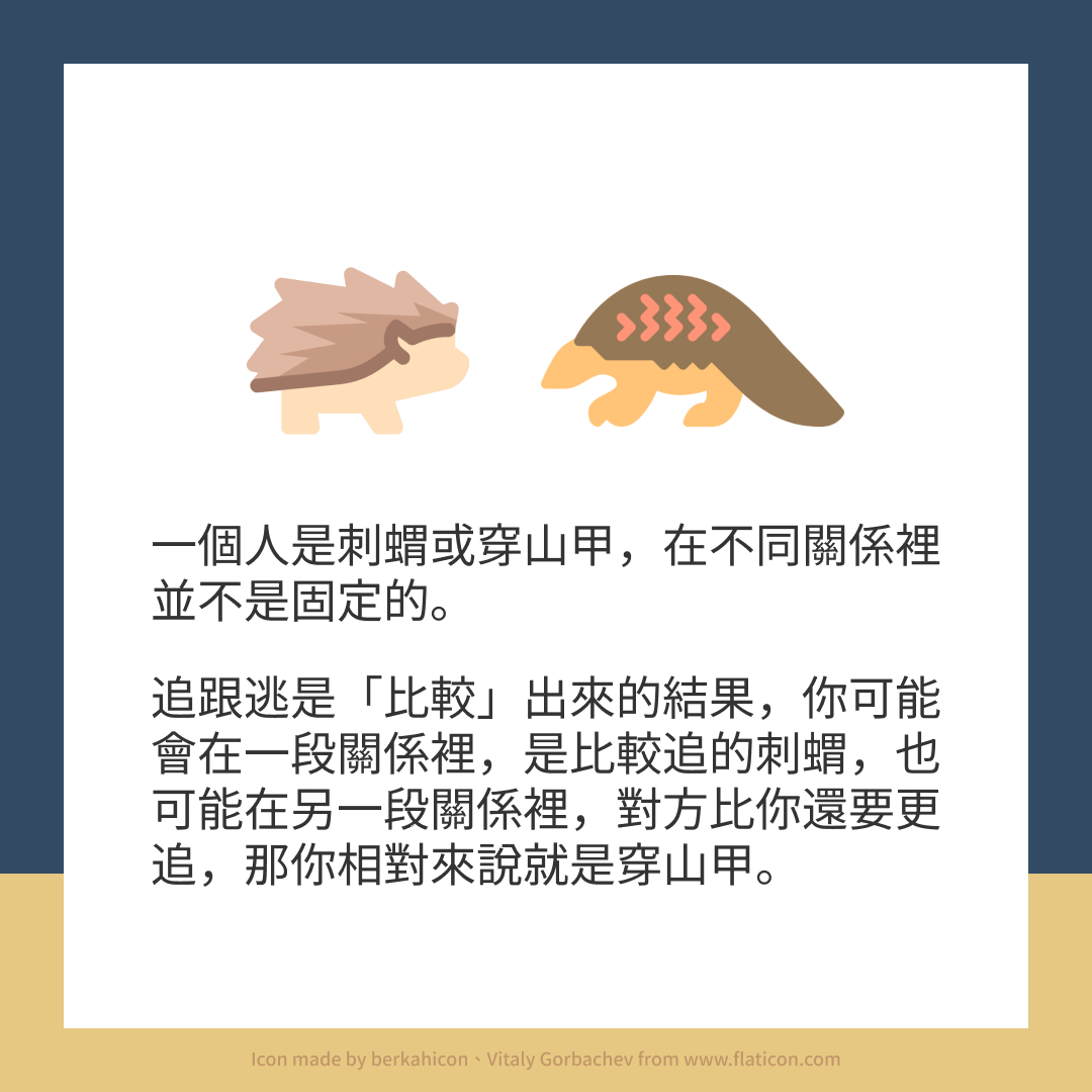 ※ 一個人是刺蝟或穿山甲,在不同關係裡並不是固定的。追跟逃是「比較」出的結果,你可能會在一段關係裡,是比較追的那一方,那你就是刺蝟,也可能在另一段關係裡,對方比你還要追,那你相對來說就是穿山甲。