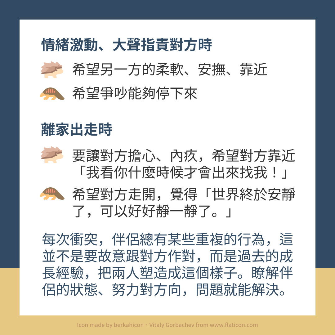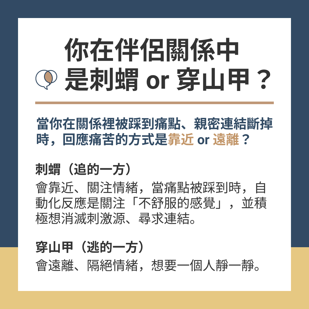 刺蝟(追的一方):會靠近、關注情緒,當痛點被踩到時,自動化反應是關注「不舒服的感覺」,並積極想消滅刺激源、尋求連結