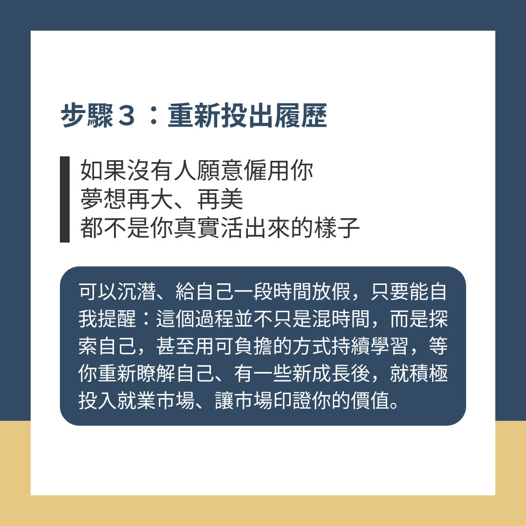 可以沉潛、給自己一段時間放個假,只要能自我提醒:這個過程並不只是混時間,而是利用時間探索自己,甚至用可負擔的方式持續學習,等你重新瞭解自己、有一些新成長後,就積極投入就業市場、讓市場印證你的價值。