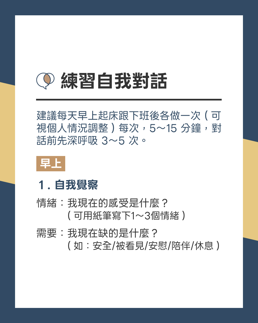 建議每天早上起床跟下班後各做一次(可視個人情況調整)每次,5~15分鐘,對話前先深呼吸 3~5 次。