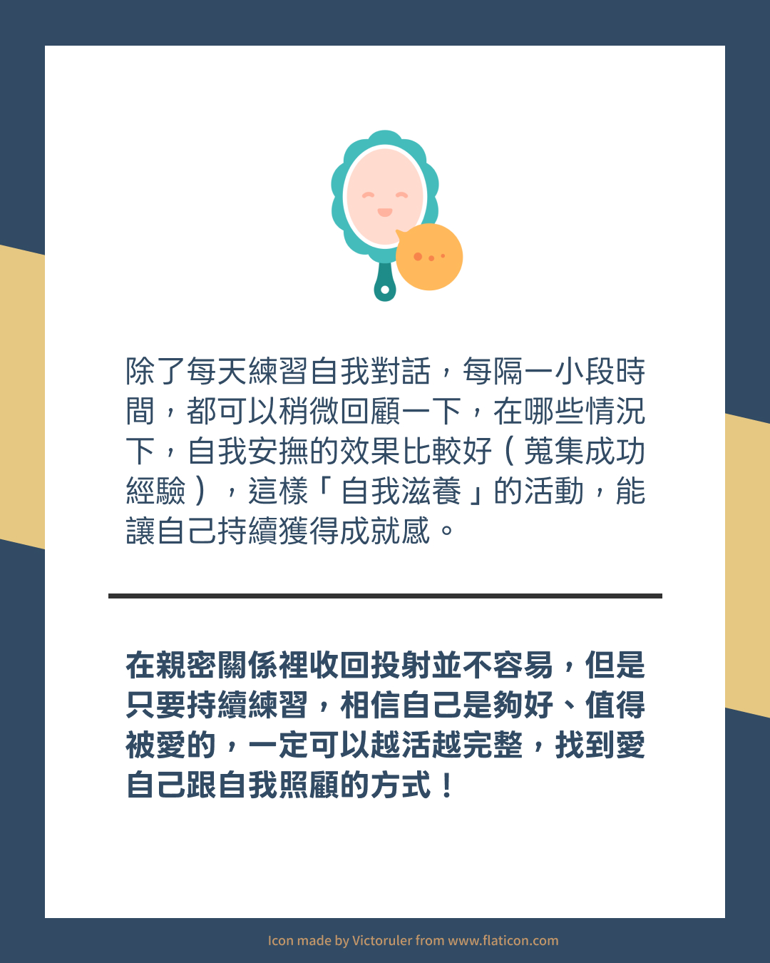 在親密關係裡收回投射並不容易,但是只要持續練習,相信自己是夠好、值得被愛的,一定可以越活越完整,找到愛自己跟自我照顧的方式!