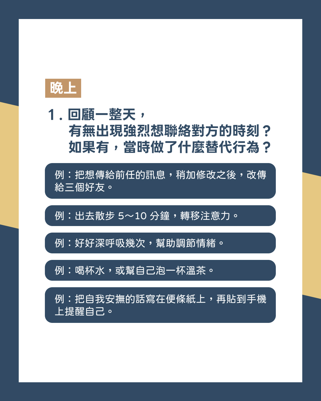 例:把想傳給前任的訊息,稍加修改之後,改傳給三個好友;出去散步5~10分鐘,轉移注意力;好好深呼吸幾次,幫助調節情緒;喝杯水,或幫自己泡一杯溫茶;把自我安撫的話寫在便條紙上,再貼到手機上提醒自己。