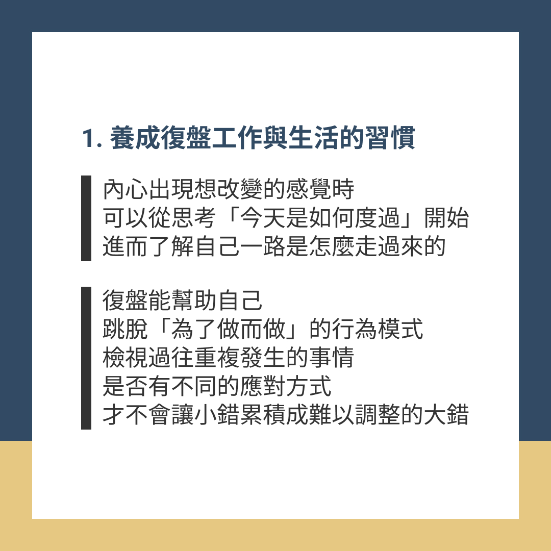 復盤能幫助自己跳脫「為了做而做」的行為模式,檢視過往重複發生的事情,是否有不同的應對方式,才不會讓小錯累積成難以調整的大錯