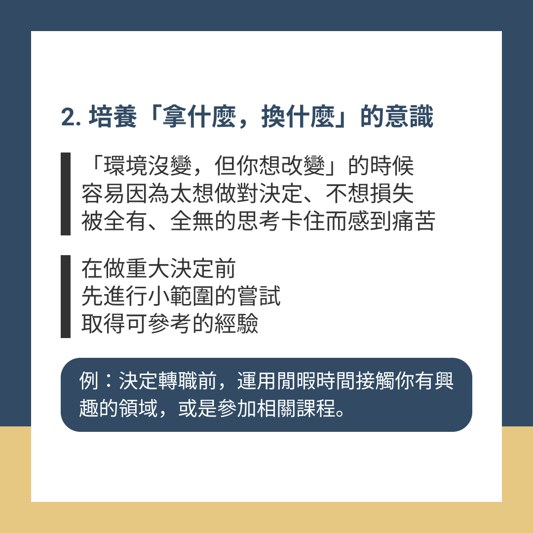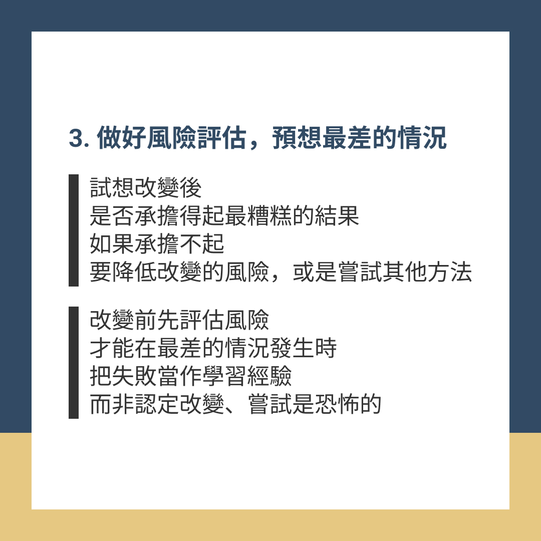 試想改變後,是否承擔得起最糟糕的結果,如果承擔不起,需要降低改變的風險,或是嘗試其他方法