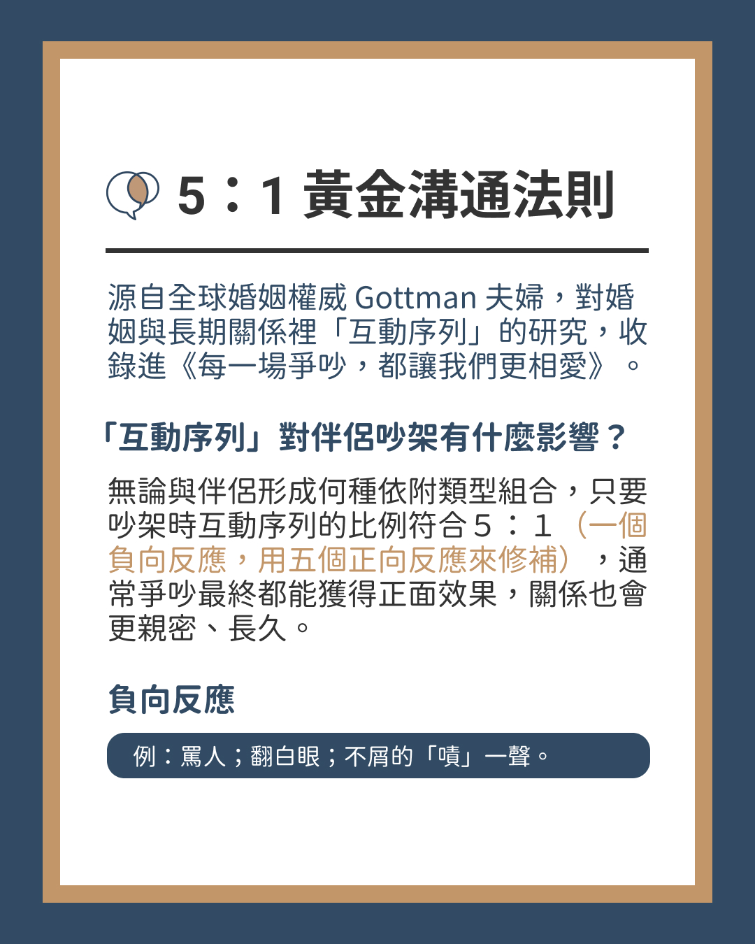 無論與伴侶形成何種依附類型組合,只要吵架時互動序列的比例符合「5:1」(一個負向反應,用五個正向反應來修補),通常爭吵最終都能獲得正面效果,關係也會更親密、長久。