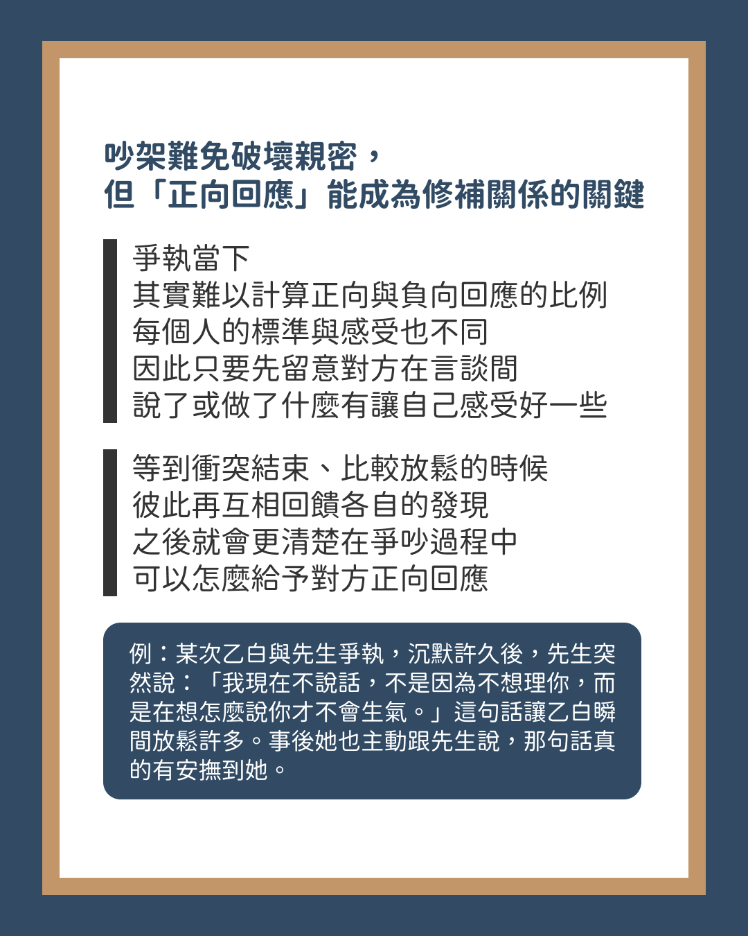 等到衝突結束、比較放鬆的時候,彼此再互相回饋這份發現,之後就會更清楚在爭吵過程中,可以怎麼給予對方正向回應