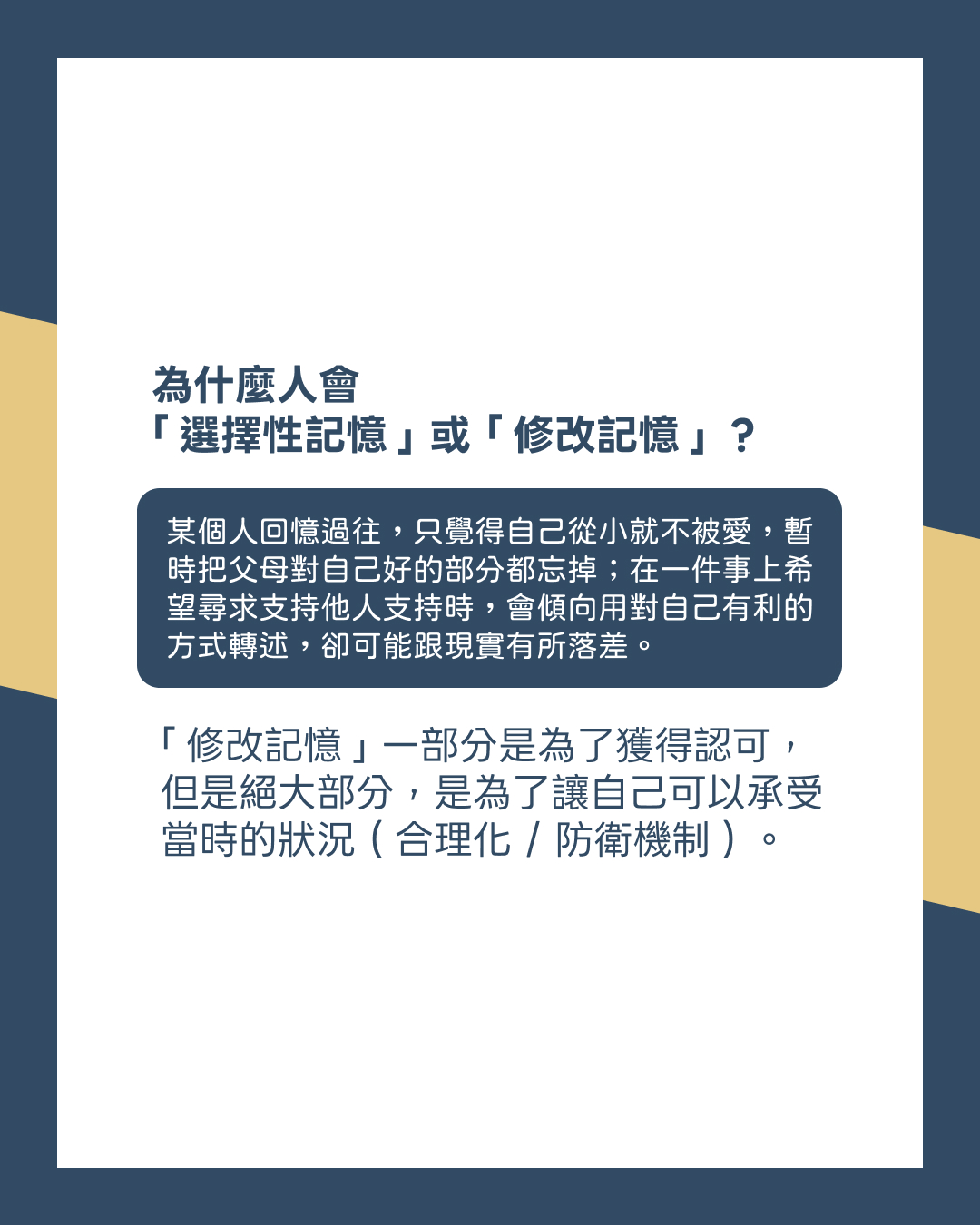 「修改記憶」一部分是為了獲得他人的認可,但是絕大部分是為了讓自己可以承受當時的狀況(合理化/防衛機制)