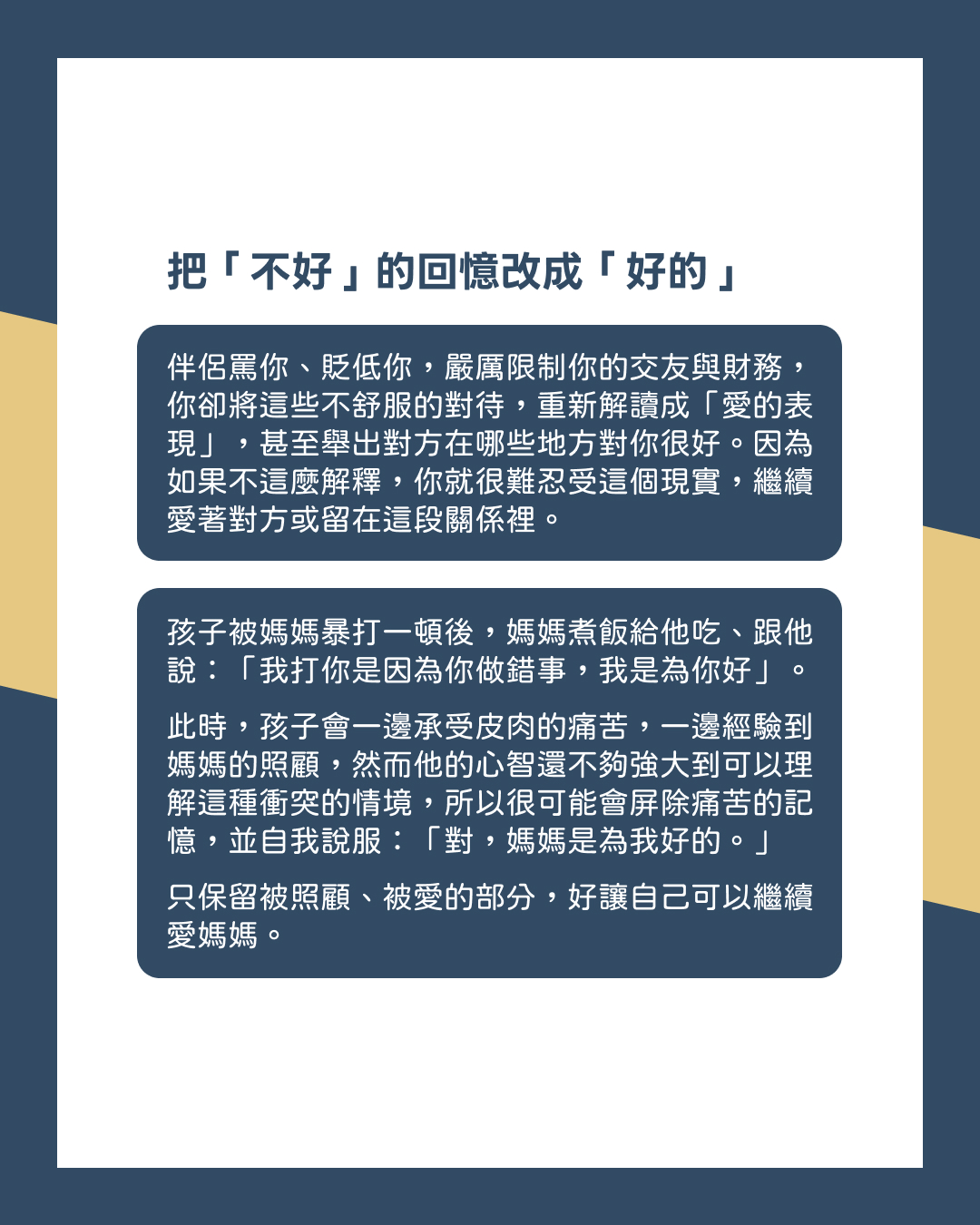 「修改記憶」:你還記得事實,但是潛意識裡用不同的方式重新解釋,讓事情可以被自己所接受