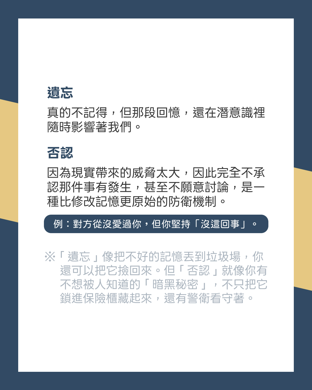 *「遺忘」就像把不好的記憶丟到垃圾場,但你還可以把它撿回來。但「否認」就像是你有不想被人知道的「暗黑秘密」,不只把它鎖進保險櫃藏起來,還有警衛看守著。