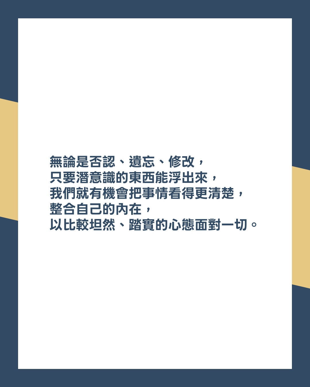 整合之後,我們會比較能夠接納自己的好與壞,容許人是可以改變的,以比較健康與包容的心態對待自己與他人