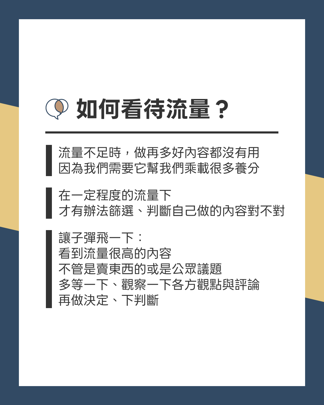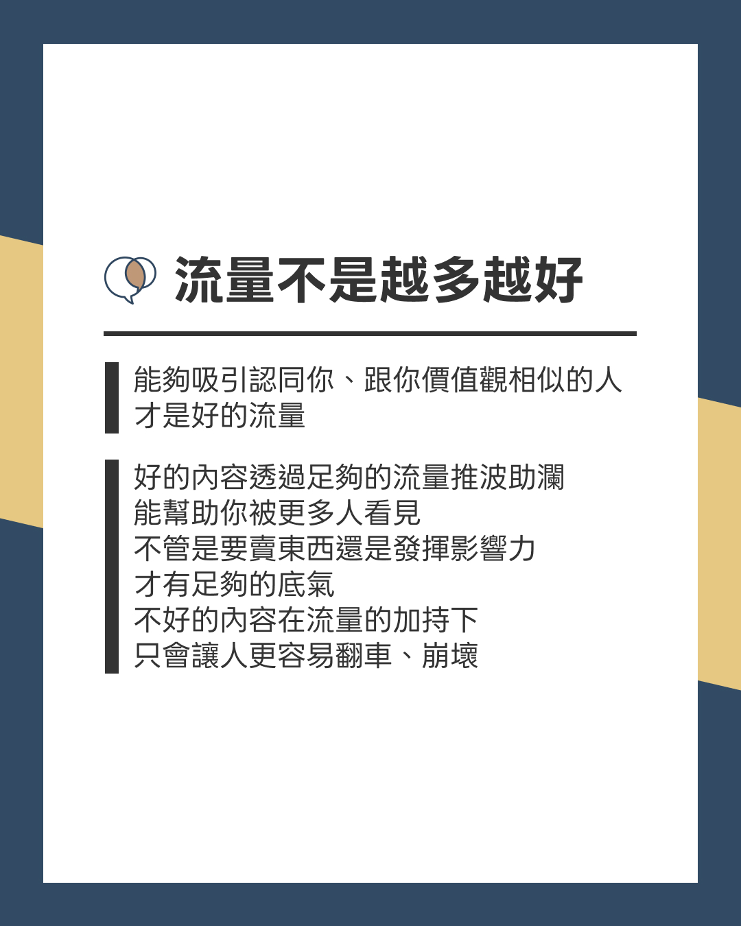 好的內容,透過足夠的流量推波助瀾,能幫助你被更多人看見,不管是要賣東西還是發揮影響力,才有足夠的底氣;不好的內容在流量的加持下,只會讓人更容易翻車、崩壞