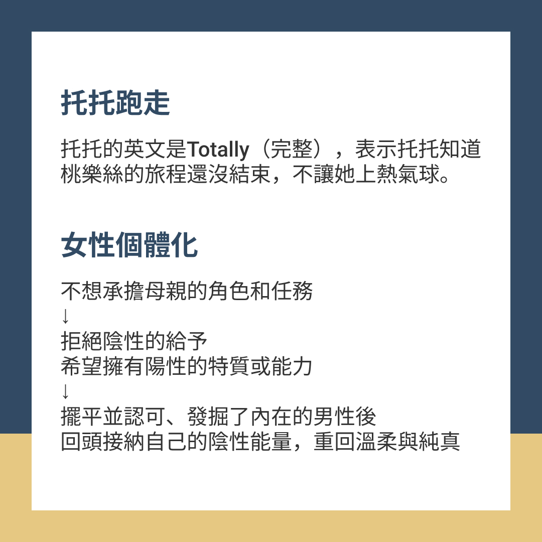 女性個體化的旅途,步向對於陰性能量的接納,在擺平並認可、發掘了內在的男性(奧茲國王)後,要回頭接納自己的陰性能量,重回溫柔與純真