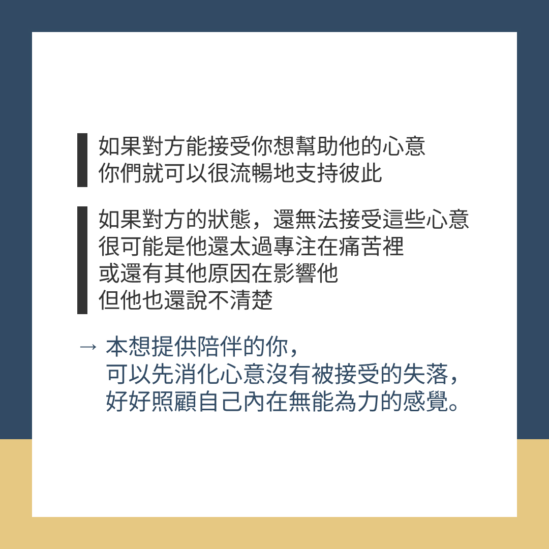 → 本想提供陪伴的你,可以先消化心意沒有被接受的失落,好好照顧自己內在無能為力的感覺。
