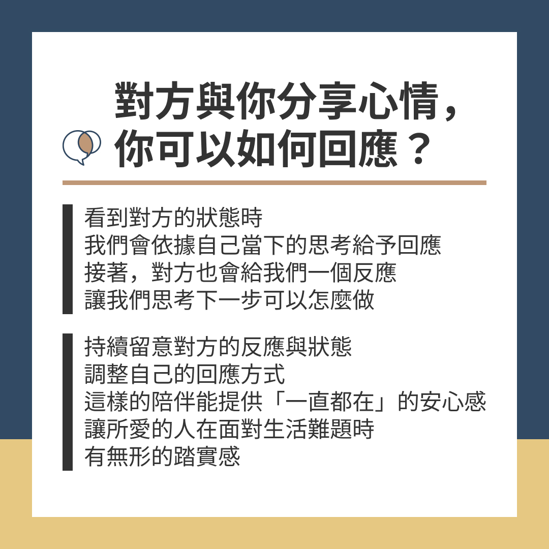 持續留意對方的反應與狀態,然後調整自己的回應方式,這樣的陪伴,可以提供「一直都在」的安心感,讓所愛的人在面對生活難題時,有無形的踏實感