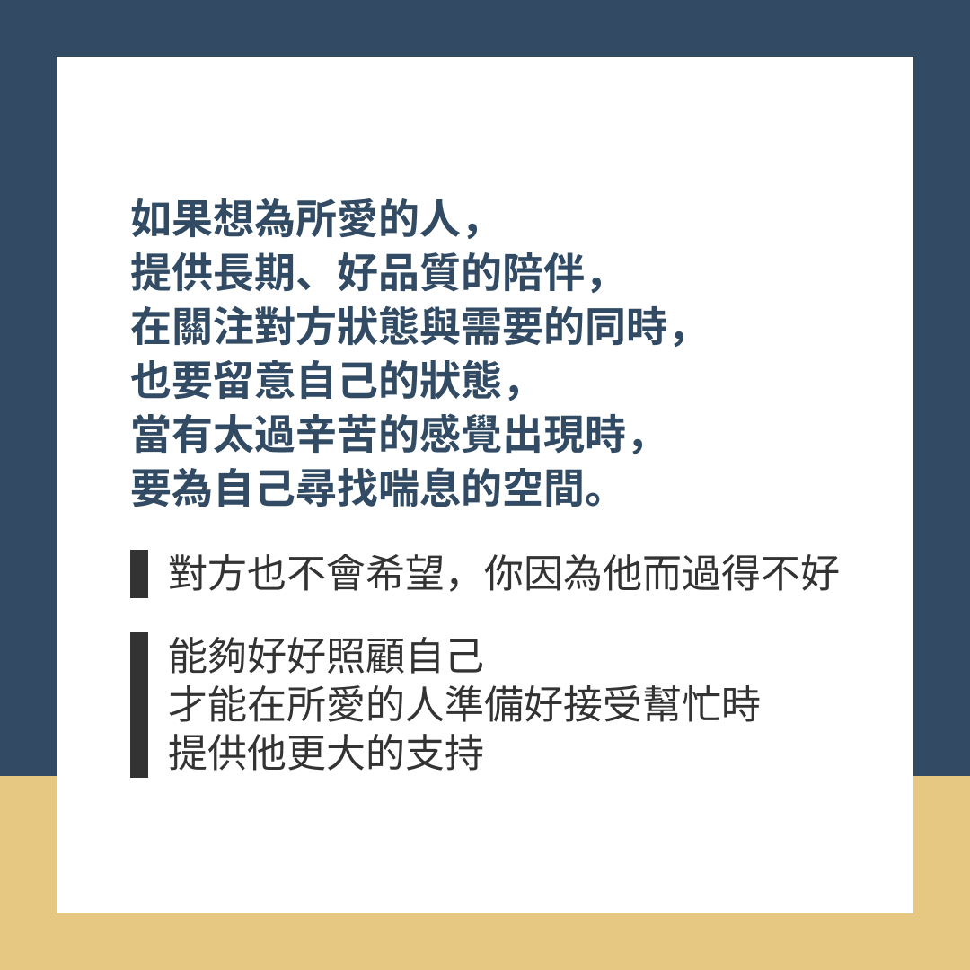→ 如果想為所愛的人,提供這樣長期、好品質的陪伴,在關注對方狀態與需要的同時,也要留意自己的狀態,當有太過辛苦的感覺出現時,要為自己尋找喘息的空間。