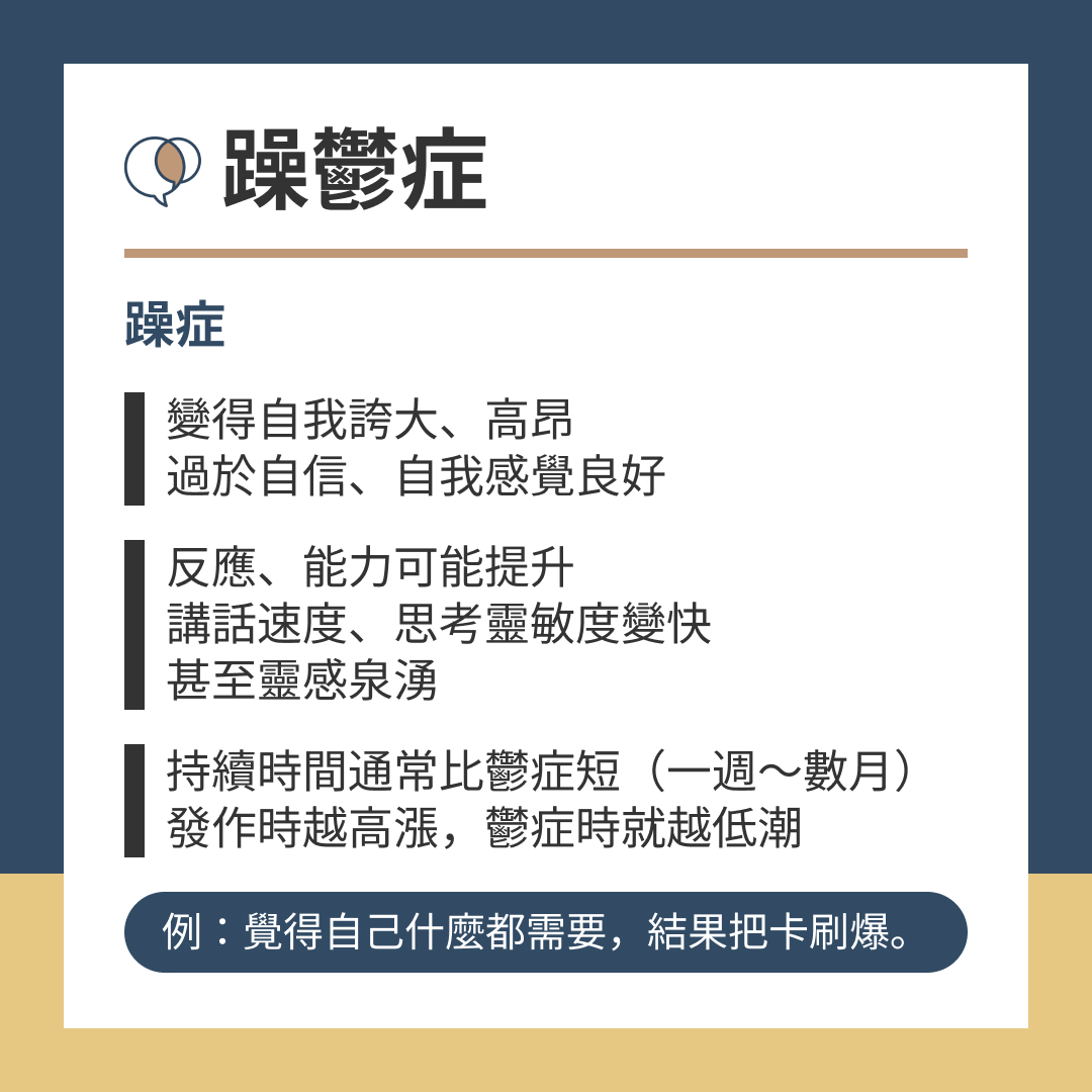 ※ 輕躁:持續時間較短、幅度不大,發作時感覺精力較充沛、靈感較多,想做比較多事。