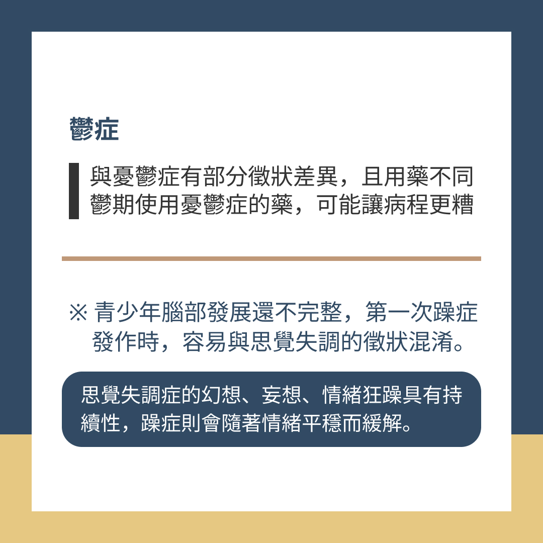 青少年腦部發展還不完整,因此第一次躁症發作時,容易與思覺失調的徵狀混淆(思覺失調症的幻想、妄想、情緒狂躁具有持續性,躁症則會隨著情緒平穩而緩解)
