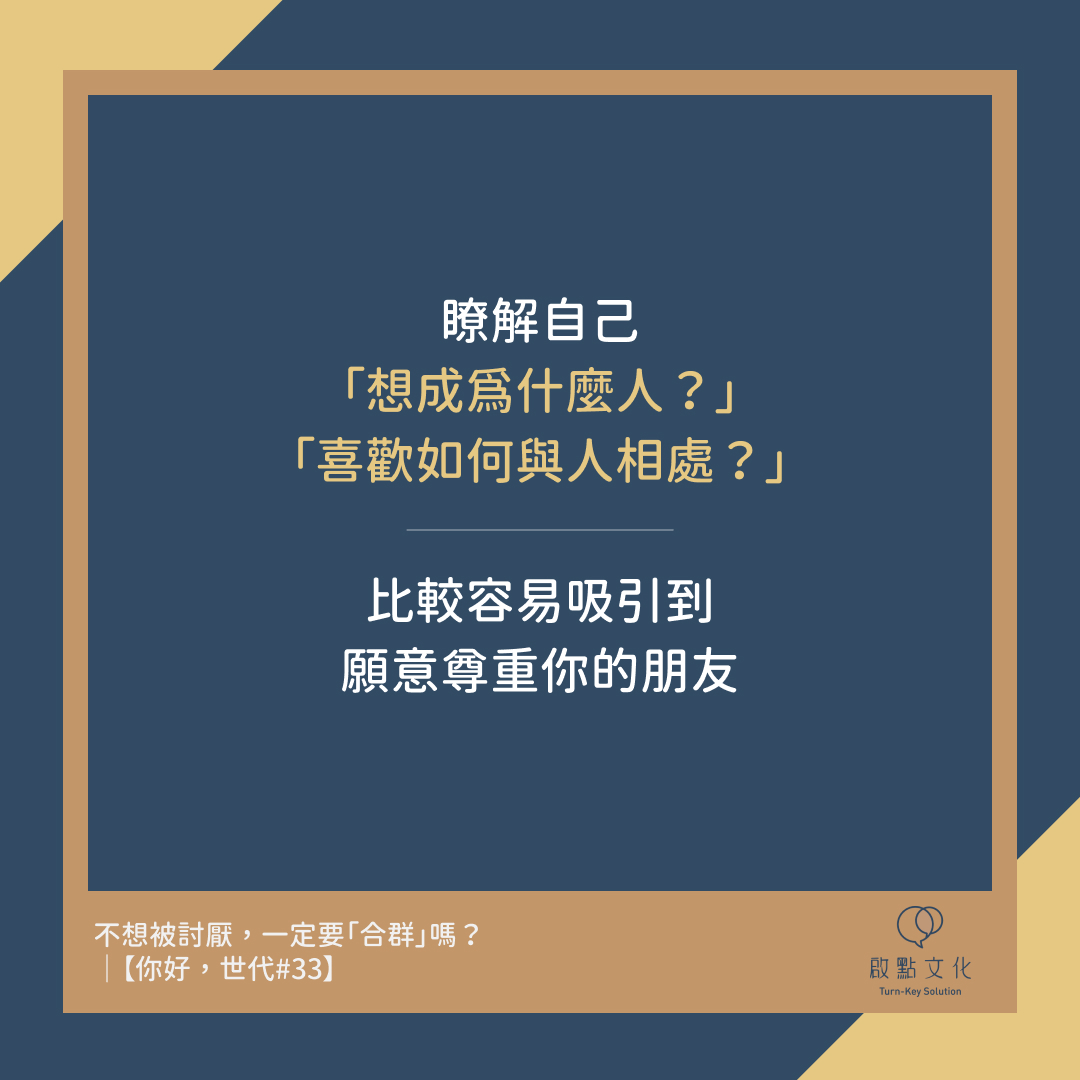 → 關鍵在於了解你自己「想成為什麼人」、「喜歡如何與人相處」,比較容易吸引到願意尊重你的朋友。