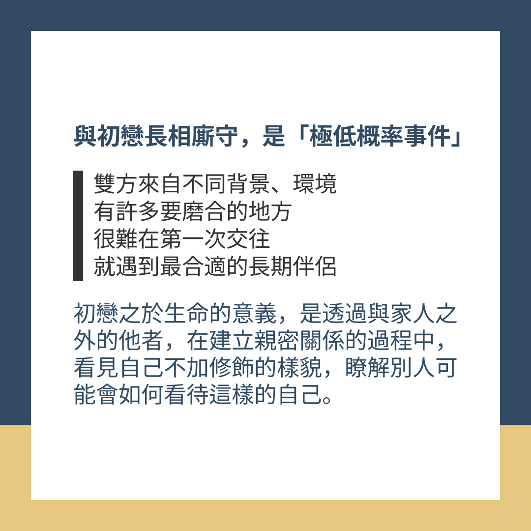 把初戀看作人生旅程的一部分,可以努力經營,但不要將「堅持一輩子」作為前提