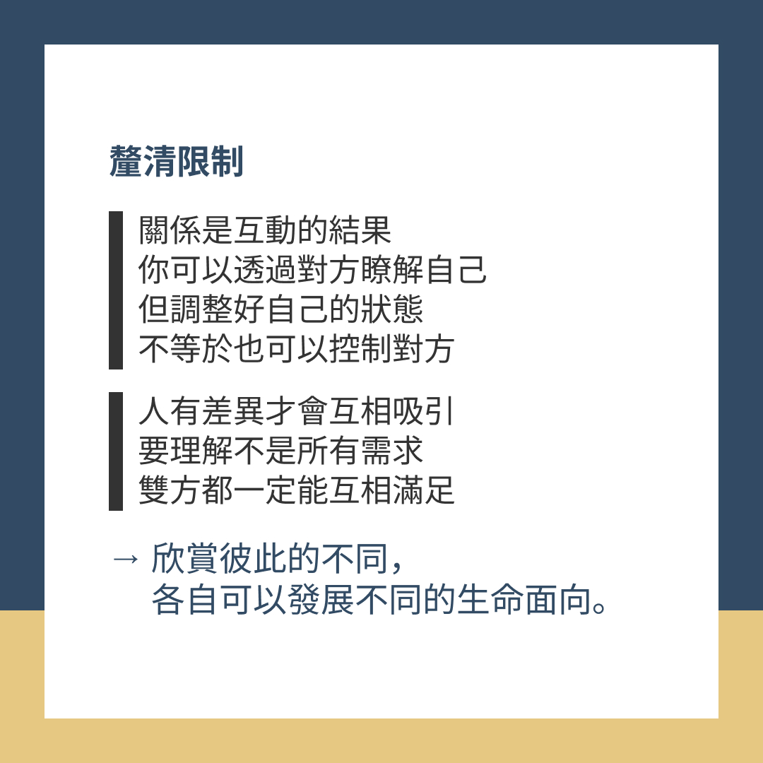 人有差異才會互相吸引,要理解不是所有需求,雙方都一定能互相滿足