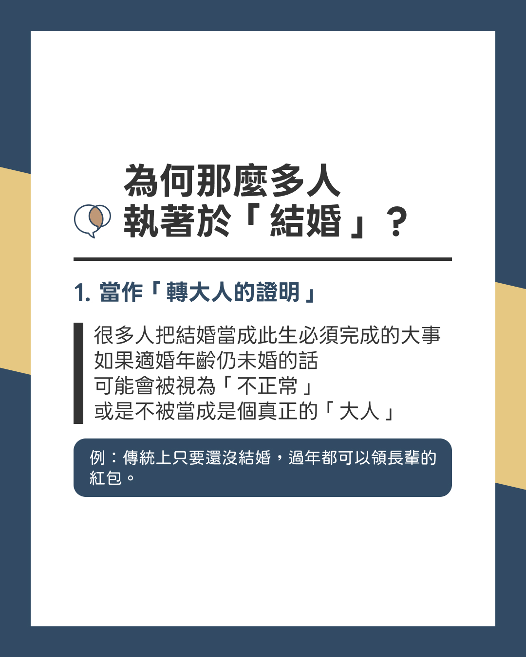 很多人會把結婚當成是此生必須完成的大事,如果適婚年齡仍未婚的話,可能會被視為「不正常」,或是不被當成是個真正的「大人」