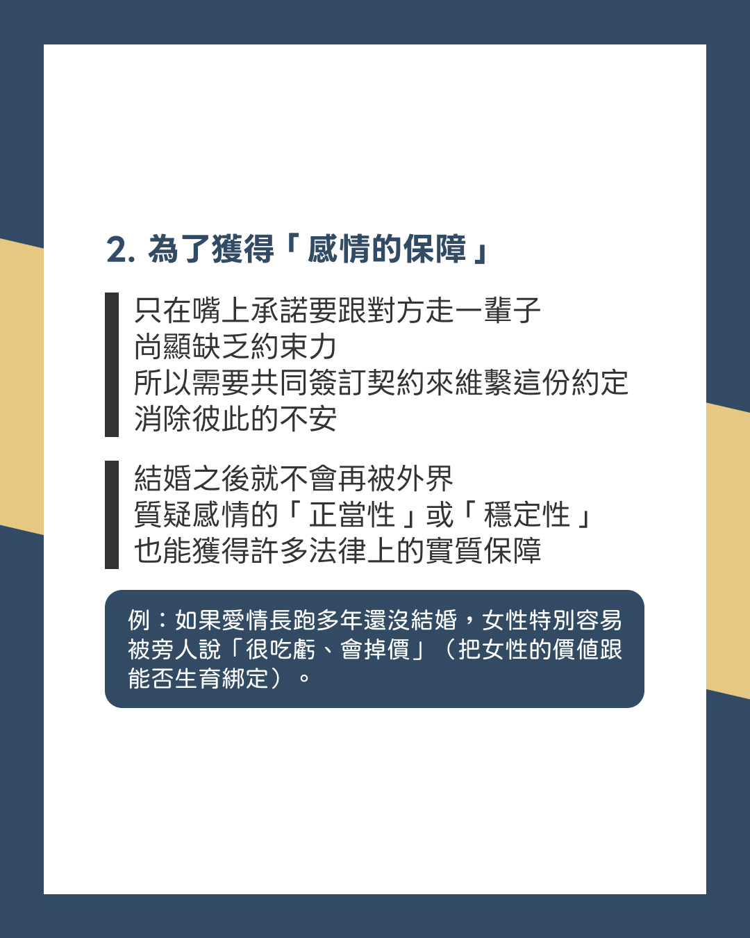 婚姻可以保障法律權利(繼承、保險、社會地位、財產),而讓關係能得到社會的承認,但無法保障「有愛情」