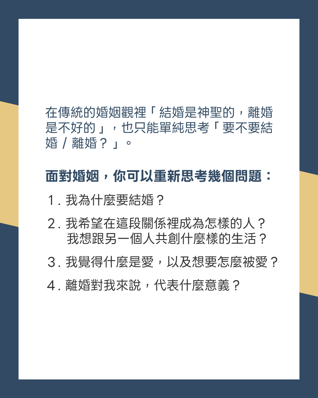 在傳統的婚姻觀裡,「結婚是神聖的,離婚是不好的」,也只能單純思考「要不要結婚/離婚?」。因此面對婚姻,可以重新思考幾個問題: