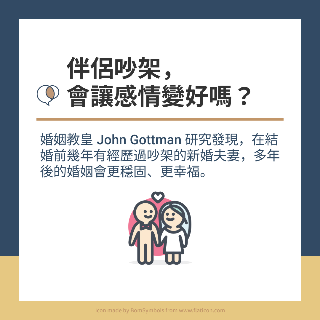 婚姻教皇 John Gottman 研究發現,在結婚前幾年有經歷過吵架的新婚夫妻,多年後的婚姻會更穩固、更幸福。