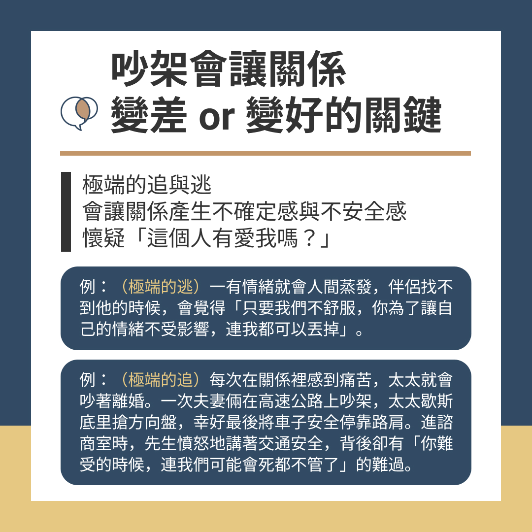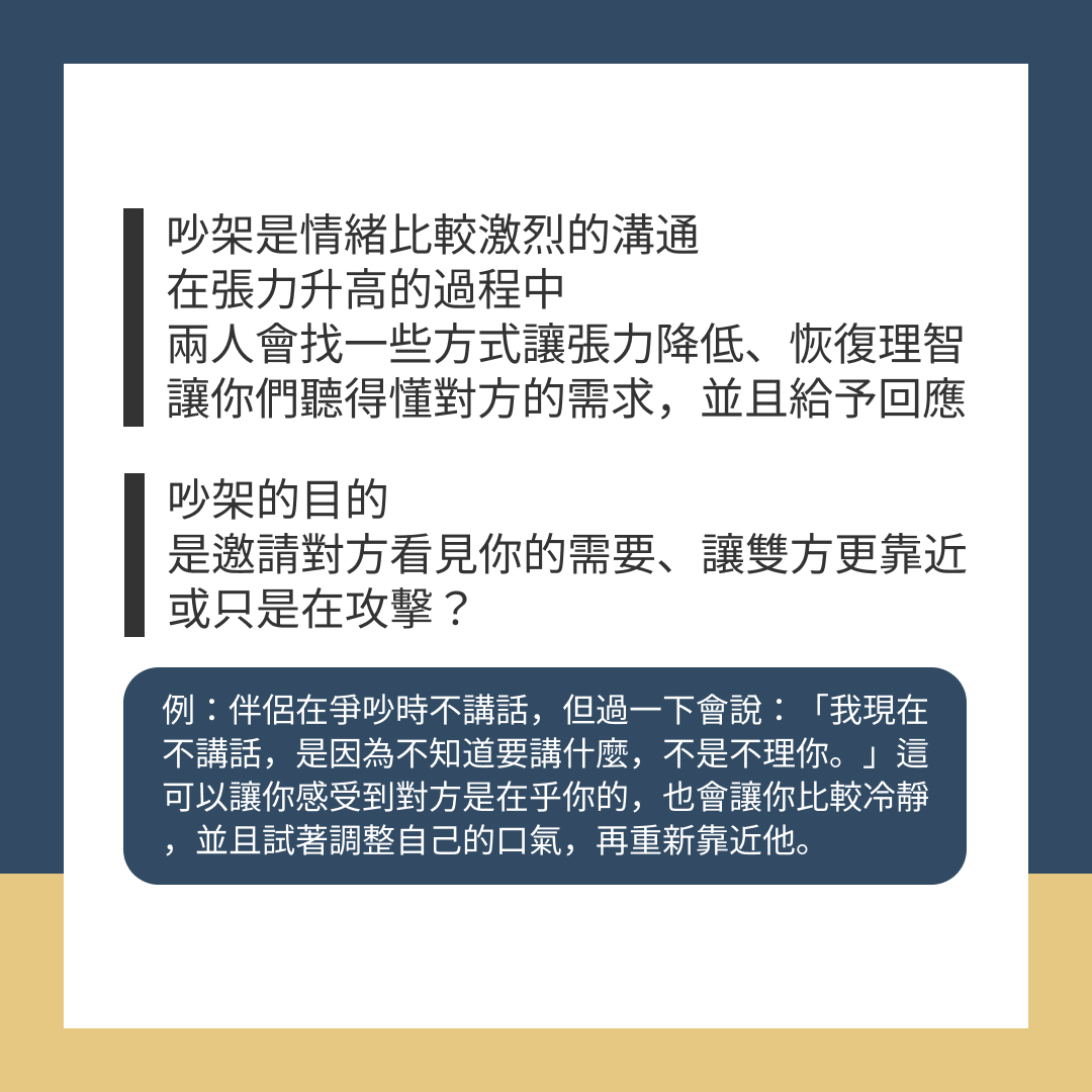 吵架是情緒比較激烈的溝通,在張力升高的過程中,兩人會找一些方式讓張力降低、恢復理智,讓你們聽得懂對方的需求,並且給予回應
