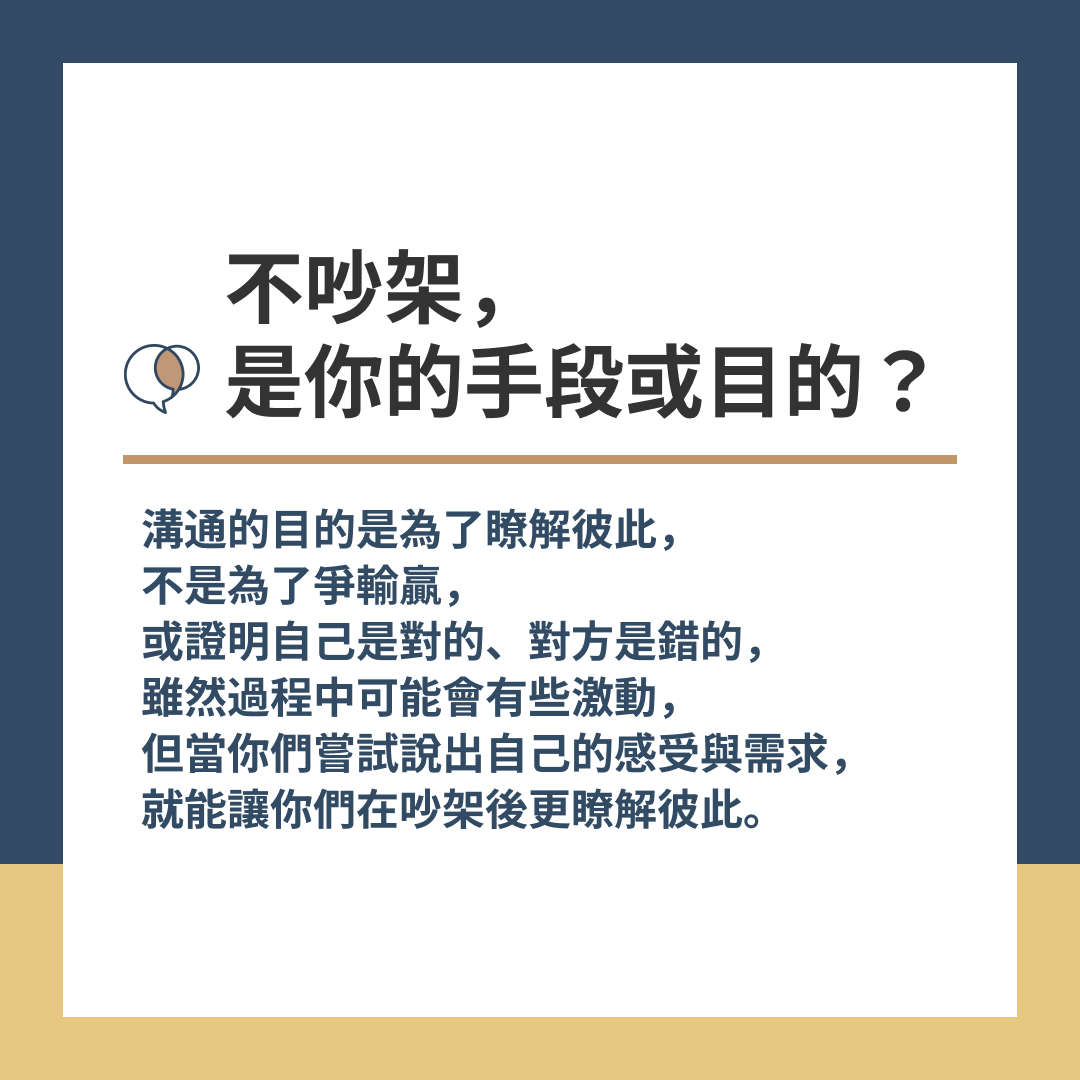 溝通的目的,是為了瞭解彼此,不是為了爭輸贏,或證明自己是對的、對方是錯的,雖然過程中可能會有些激動,但當你們嘗試說出自己的感受與需求,就能讓你們在吵架後更瞭解彼此。