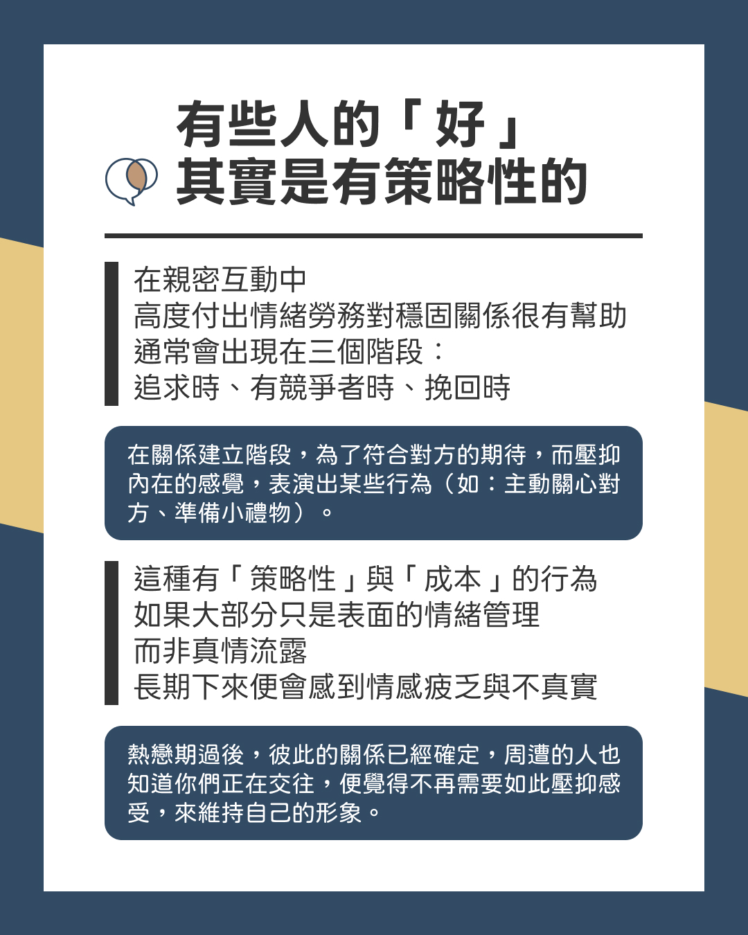 然而這種有「策略性」與「成本」的行為,如果大部分只是表面的情緒管理,而非真情流露,長期下來便會感到情感疲乏與不真實