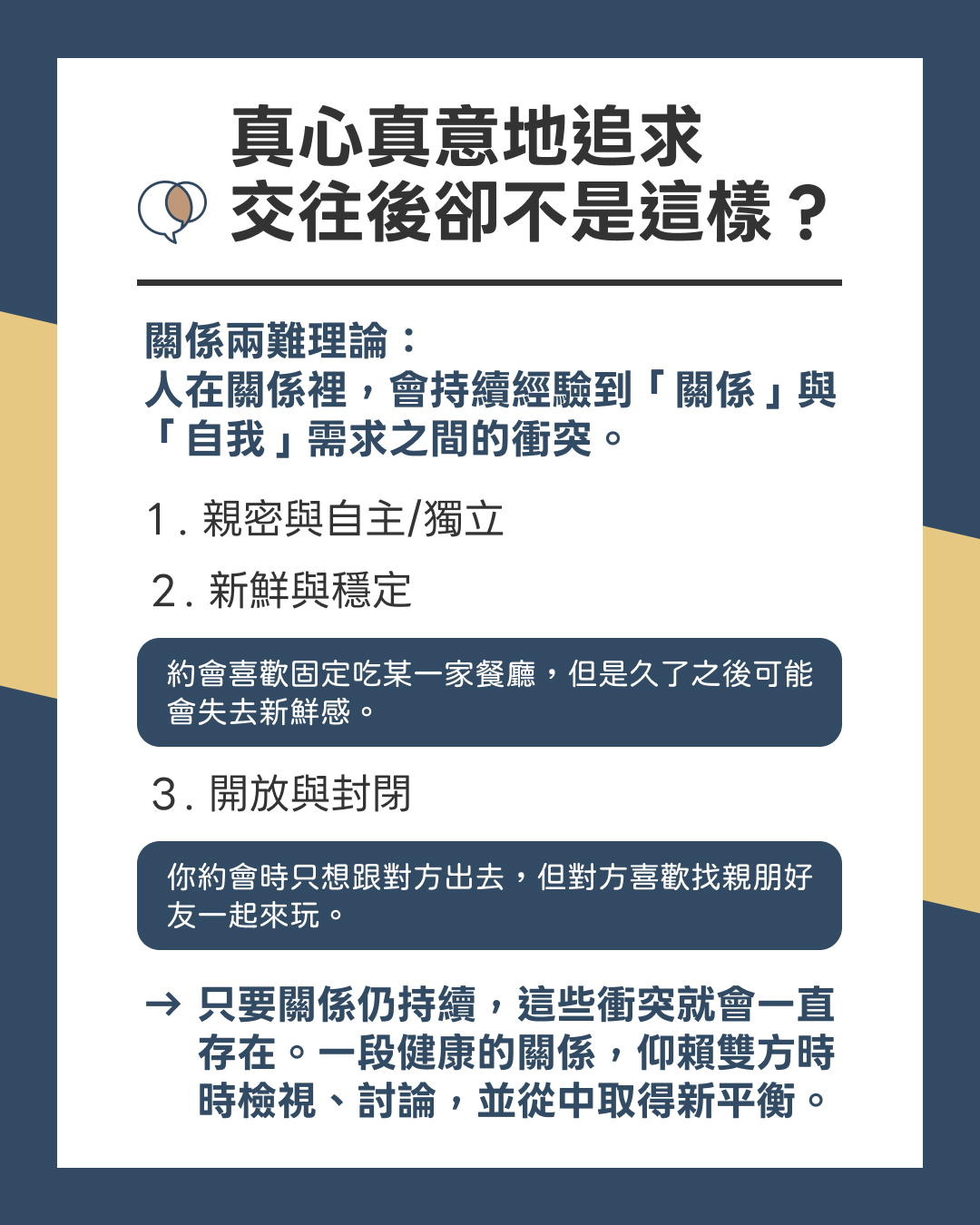 關係兩難理論:人在關係裡,會持續經驗到「關係」與「自我」的需求之間的衝突。