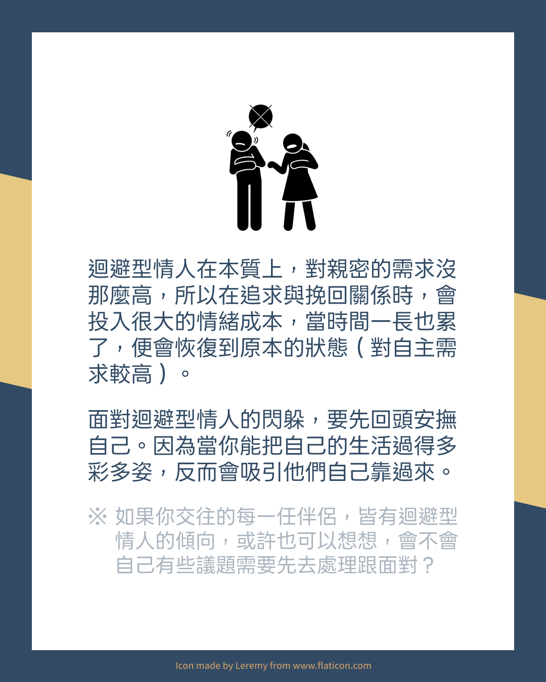 如果你交往的每一任伴侶,皆有迴避型情人的傾向,或許也可以想想,會不會自己有些議題需要先去處理跟面對?