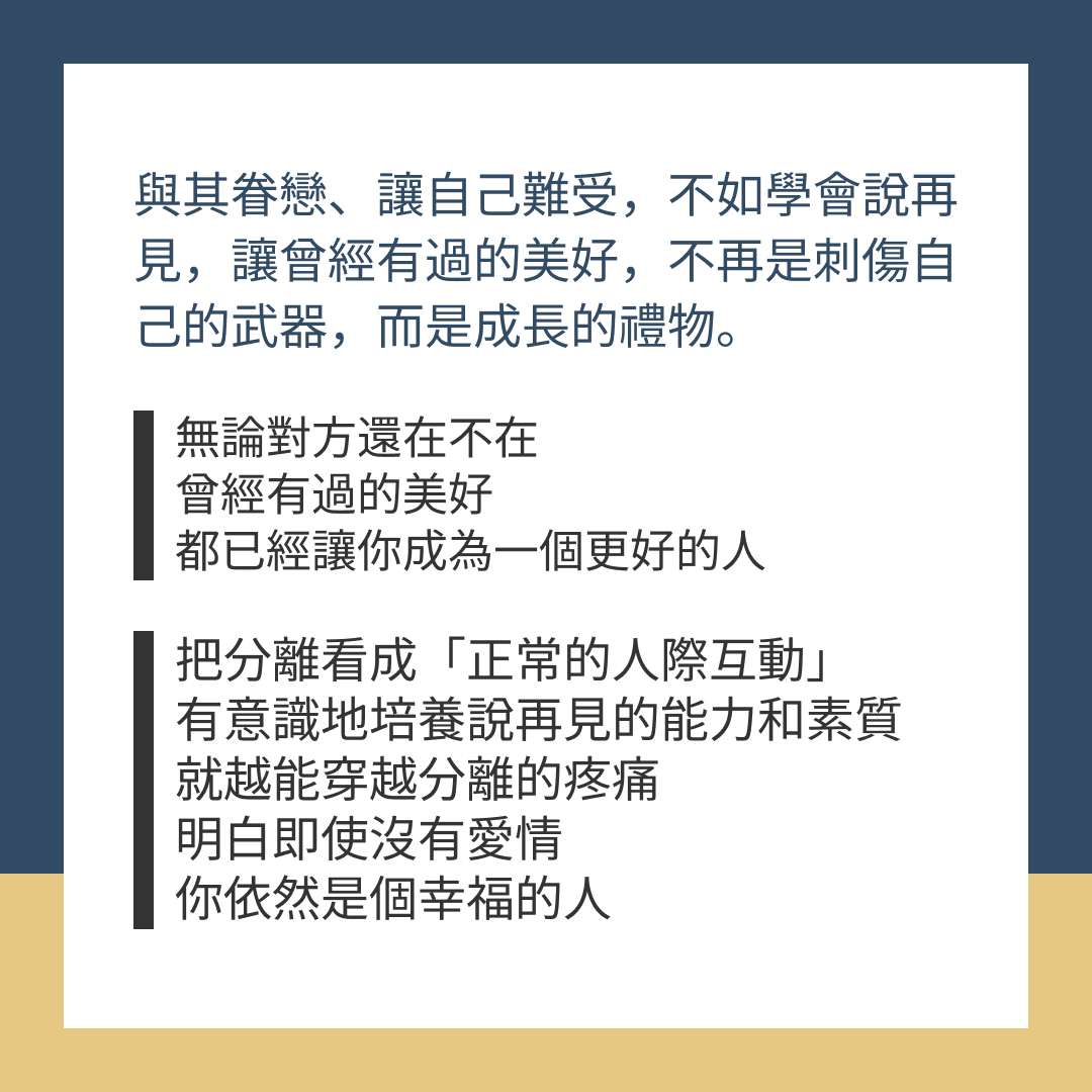 把分離看成「正常的人際互動」,有意識地培養說再見的能力和素質,就越能穿越分離的疼痛,明白即使沒有愛情,你依然是個幸福的人
