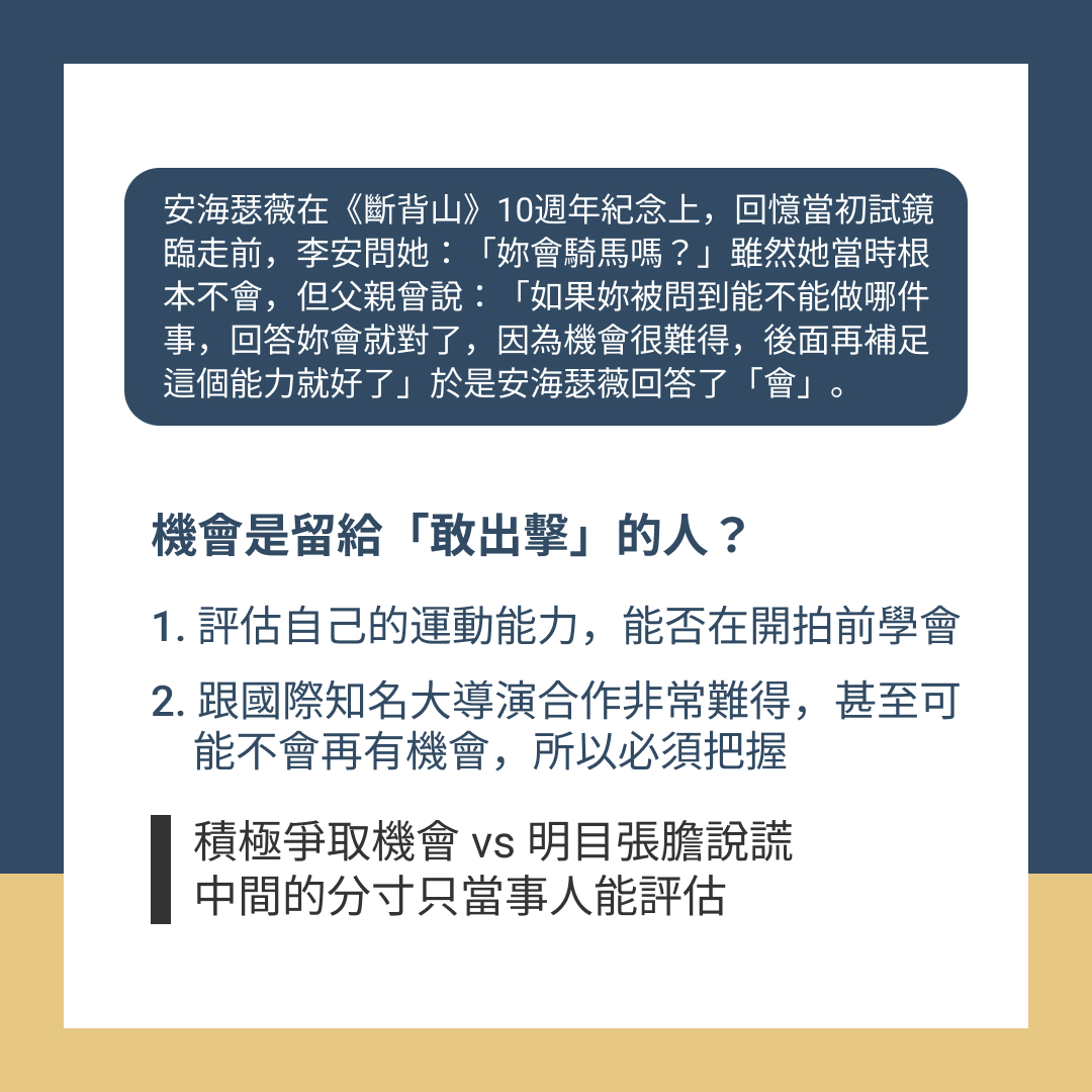 如果當時安海瑟威是大明星了,而李安則是小導演,當李安問她會不會騎馬,她要考慮的成本,可能會是個人興趣、演藝生涯規畫、接洽中的代言。