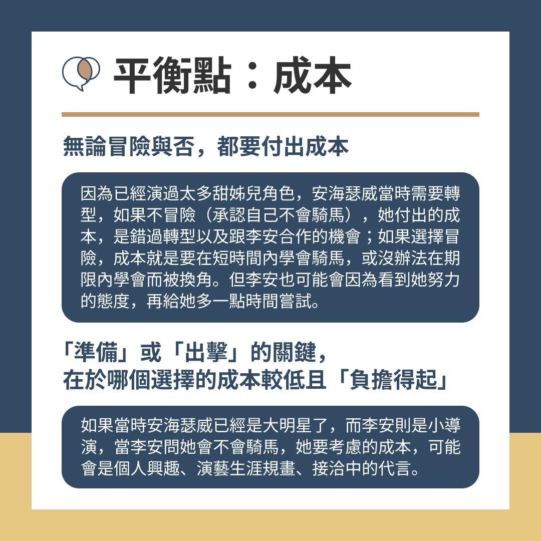 因為已經演過太多甜姊兒的角色,安海瑟威當時需要轉型,如果不冒險(承認自己不會騎馬),她付出的成本,是錯過轉型與跟李安合作的機會;如果選擇冒險,成本就是要在短時間內學會騎馬,或沒辦法在期限內學會而被換角。但李安也可能會因為看到她努力的態度,再給她多一點時間嘗試。