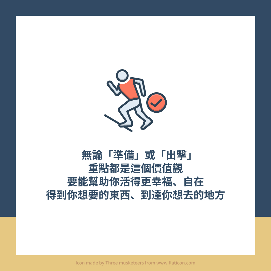 無論是「準備」或「出擊」,重點都是這個價值觀,要能幫助你活得更幸福、自在,以及得到你想要的東西、到達你想去的地方。