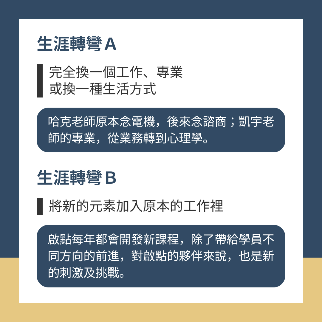 生涯轉彎A — 積累一些名聲、建立了個人品牌,讓學員看見生涯更多可能,於是鼓起勇氣離開學校,成為自由工作者