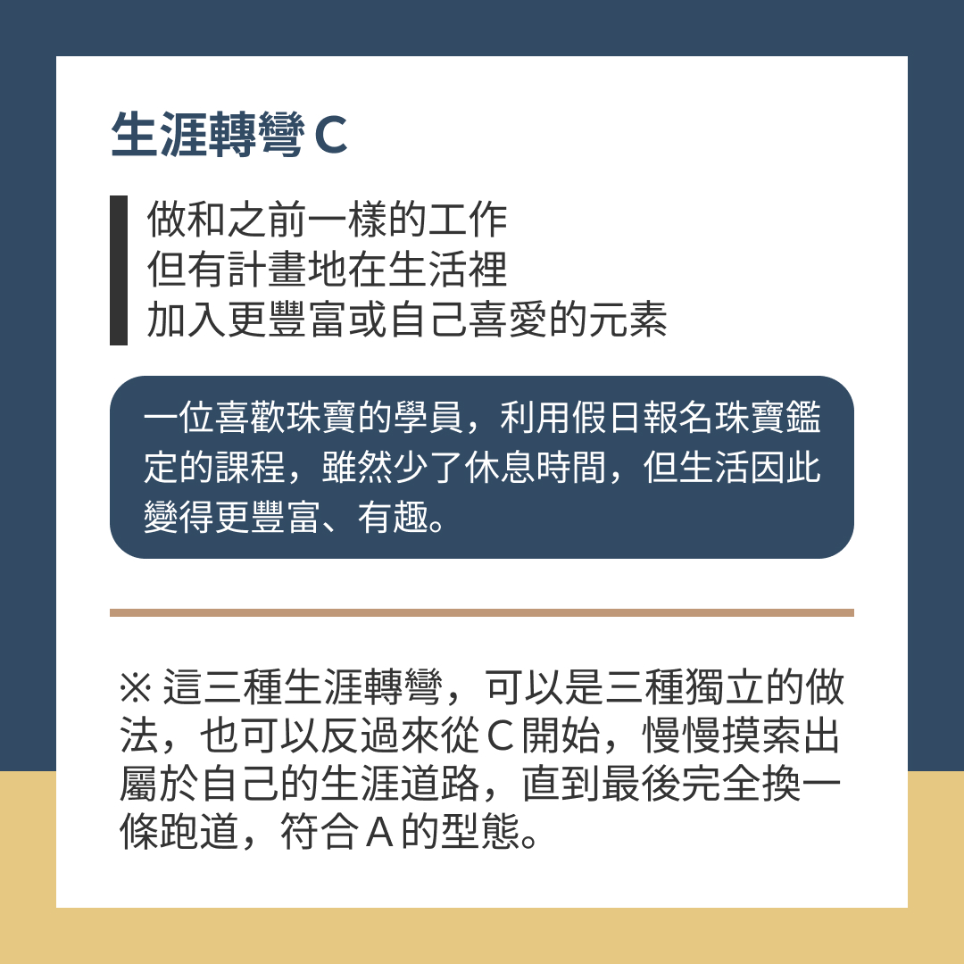 ※ 這三種生涯轉彎,可以是三種獨立的做法,也可以反過來從C開始,慢慢摸索出屬於自己的生涯道路,直到最後完全換一條跑道,符合A的型態。