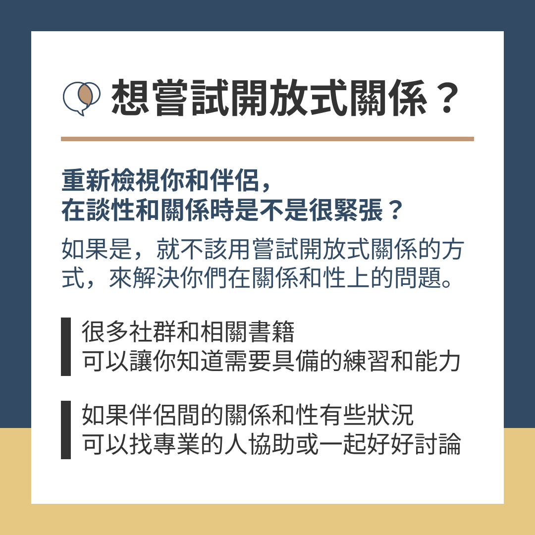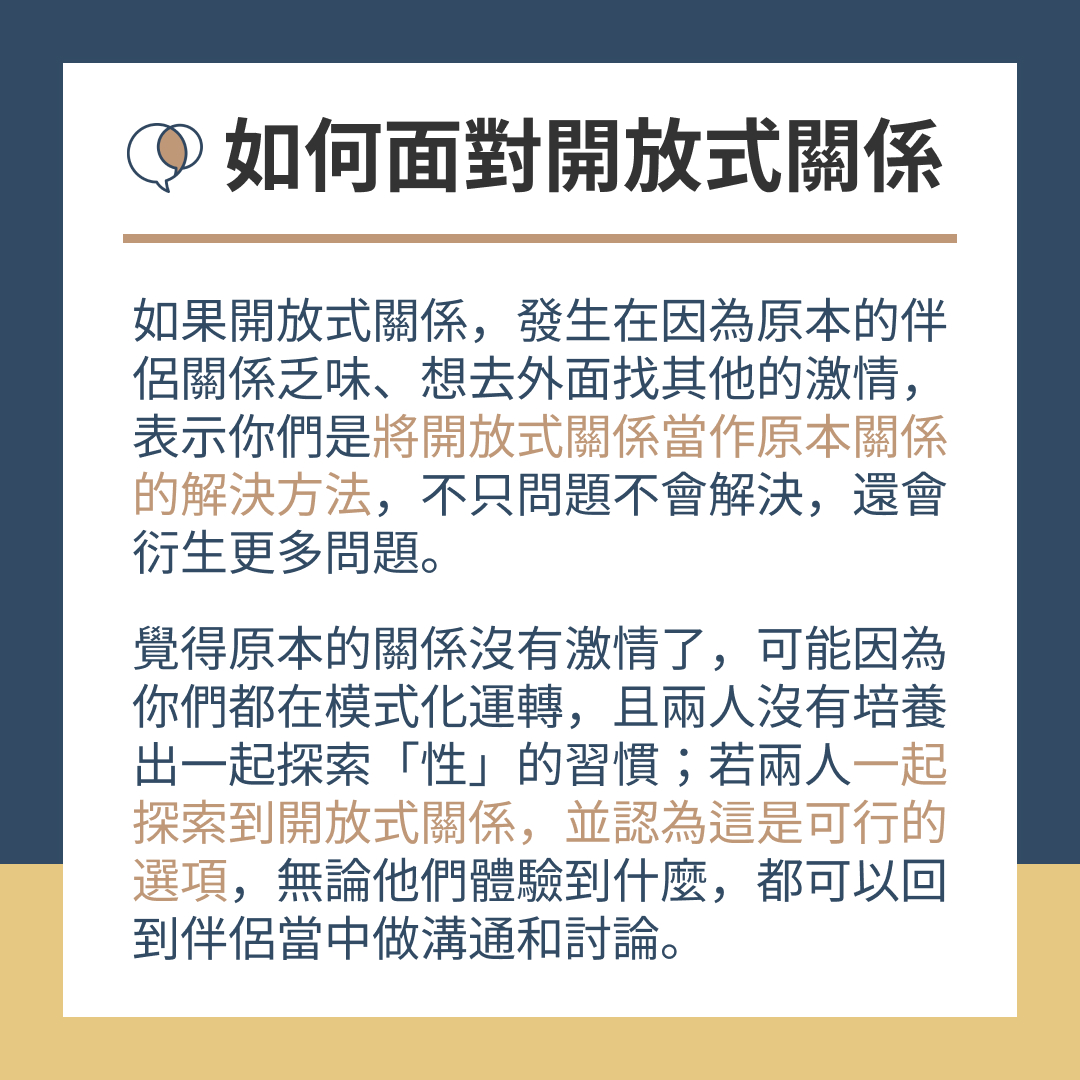 如果你覺得關係沒有激情了,可能因為你們都在模式化運轉,且兩人沒有培養出一起探索性的習慣,才會沒有新鮮感;如果兩人一起探索到開放式關係,並認為這是可行的選項,無論他們體驗到什麼,都可以回到伴侶當中做溝通和討論。