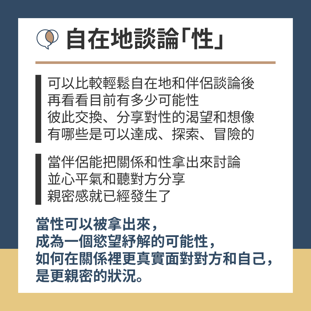 當伴侶能把關係和性拿出來討論,並心平氣和聽方分享,親密感就已經發生了。