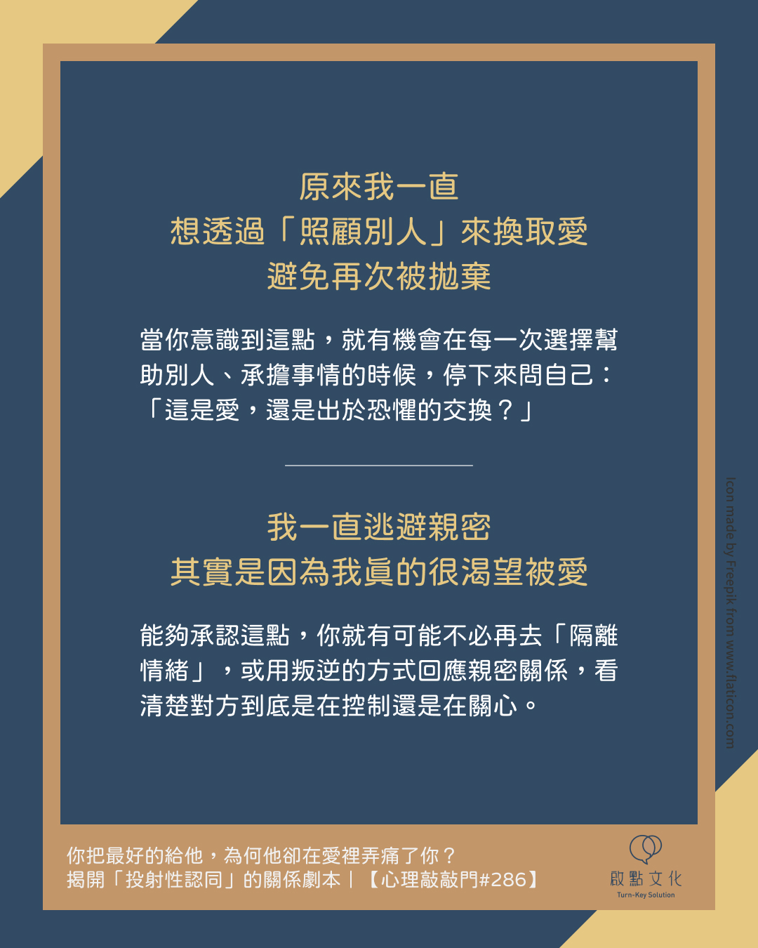 聽完故事後,如果你仍然覺得「都是某某人的問題,只要他改變就好」,代表你還未進入潛意識的層次,想透過「控制別人」來得到自己想要的。當有一天這想法再也不適用的時候,或許就是你把自己的力量收回來的時刻,意識到你過去把什麼不願承受的某種情緒、需要放到別人身上,而對方接住了。而他忠誠演出你想要的結果,何嘗不是一種真愛?