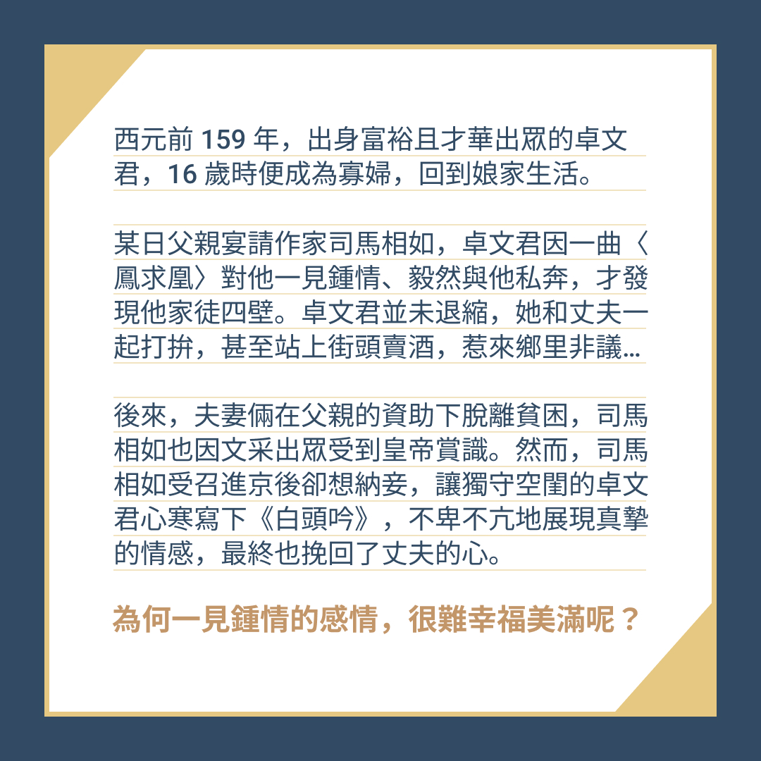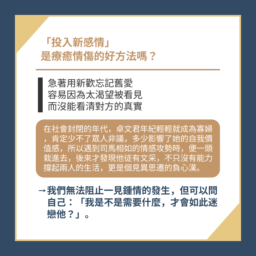 在社會封閉的年代,卓文君年紀輕輕就成為寡婦,肯定少不了眾人非議,多少影響了她的自我價值感,所以當遇到司馬相如的情感攻勢,便一頭栽進去,後來才發現他徒有文采、沒有能力撐起兩人的生活,更是個見異思遷的負心漢。